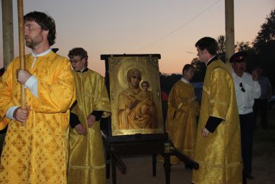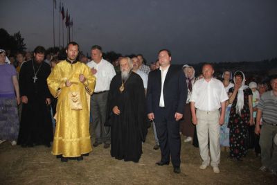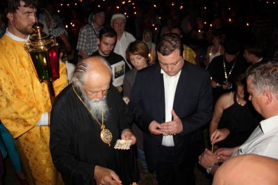 Во всенощном бдении у храма перед иконой Смоленской Божией матери и в шествии Крестного хода до лагеря фестиваля на берегу Днепра также принял участие Алексей Островский.