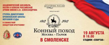 В Смоленск 19 августа прибудет Конный поход Москва-Париж 1812-2012. Он является частью государственной программы празднования 200-летия победы России Отечественной войны 1812 года. На стадионе «Спартак» в 18.00 состоится совместное выступление Академического ансамбля песни и пляски Российской армии имени А. В. Александрова и группы джигитовки Кремлевской школы верховой езды.