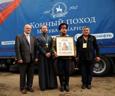 Вчера, 16 августа, участники похода прибыли в село Алексино Дорогобужского района для временной стоянки на территории местного конезавода, где прошла торжественная церемония встречи донских казаков, повторяющих путь легендарного генерала Платова. С приветственным словом к казакам обратился глава администрации муниципального образования «Дорогобужский район» Владимир Цуренков.