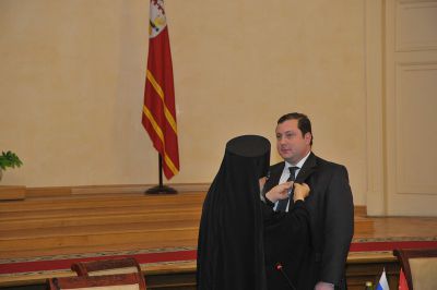 Главной темой заседания стала организация взаимодействия и расширение сотрудничества региональной власти и Смоленской епархии в решении вопросов поддержки семьи, материнства и детства – ключевых, по словам главы региона, для сохранения и развития государства. Алексей Островский поблагодарил Церковь за активную позицию в укреплении института семьи: «Я очень благодарен владыке Пантелеимону, епархии и в целом Русской Православной Церкви за то, что именно она, хотя и отделена от государства, обращает взоры чиновников на необходимость более бережно, более внимательно относится к тем проблемам, которые стоят и возникают вокруг детей, матерей, семей. Те идеи, предложения, которые стали инициативой епархии, лично владыки Пантелеимона, безусловно, должны найти отражение в работе администрации области, администраций муниципальных образований». В свою очередь епископ Смоленский и Вяземский Пантелеимон по благословению святейшего Патриарха наградил Губернатора Алексея Островского юбилейной медалью Русской православной церкви в память 200-летия победы в Отечественной войне 1812 года.