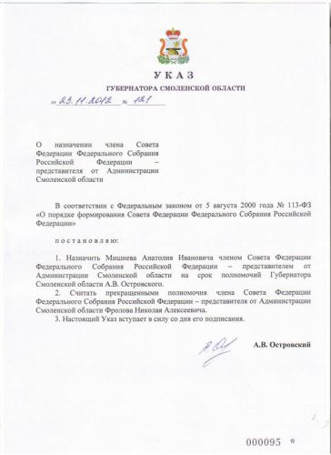Этим же Указом прекращены полномочия члена Совета Федерации Федерального Собрания Российской Федерации – представителя от Администрации Смоленской области Николая Фролова.