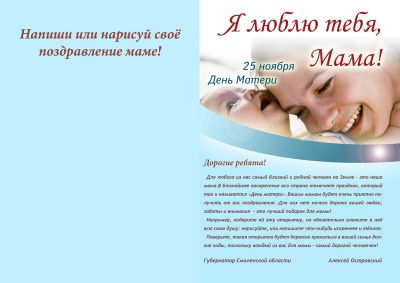 Чтобы с самого детства воспитывать в юных смолянах чувство любви и признательности к маме, Алексей Островский распорядился подготовить и раздать ученикам 1–5 классов всех школ региона открытки, с помощью которых ребята удивят своих мам оригинальным поздравлением.