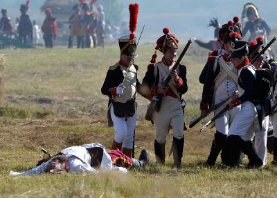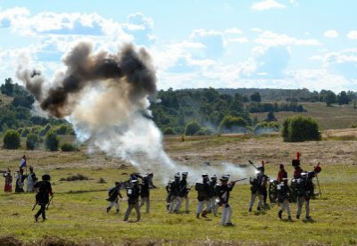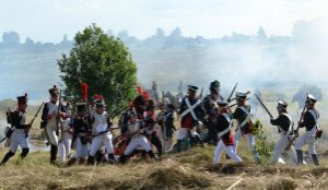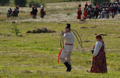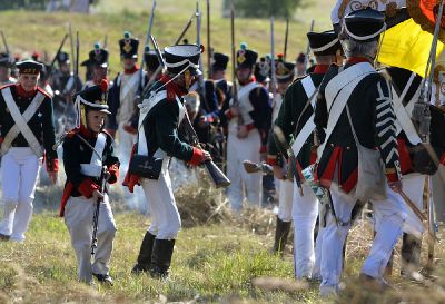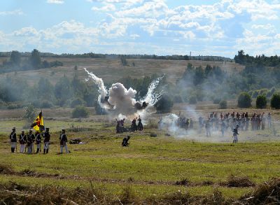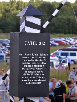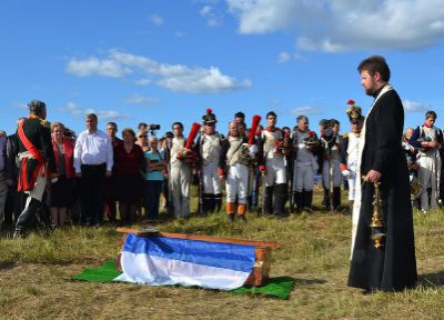 В завершении боя реконструкторы прошли марш-парадом до мемориала на Лубинском поле, где с соблюдением воинских почестей и церковных канонов состоялась церемония перезахоронения найденных в июле этого года останков русского воина, погибшего в 1812 году.