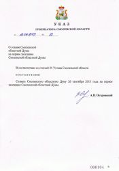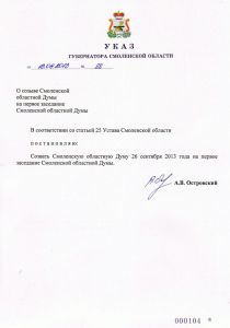 Алексей Островский подписал Указ Губернатора Смоленской области от 13.09.2013 №88 «О созыве Смоленской областной Думы на первое заседание Смоленской областной Думы». В документе, в частности, говорится: «В соответствии со статьей 25 Устава Смоленской области постановляю созвать Смоленскую областную Думу 26 сентября 2013 года на первое заседание Смоленской областной Думы».