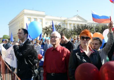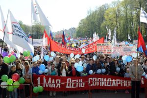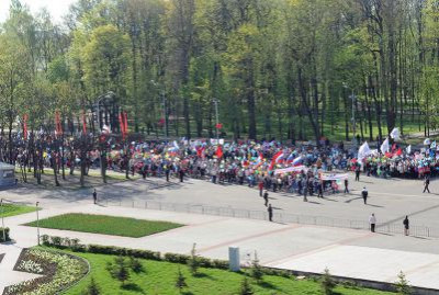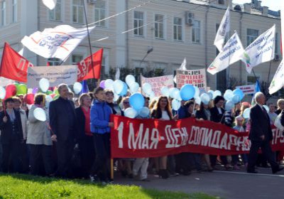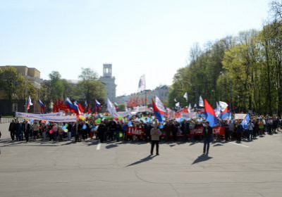 В Смоленске стройные ряды демонстрантов проследовали на главную площадь города. Представители политических партий несли флаги и цветы, профсоюзные активисты вышли встречать Первомай с лозунгами за достойный труд.