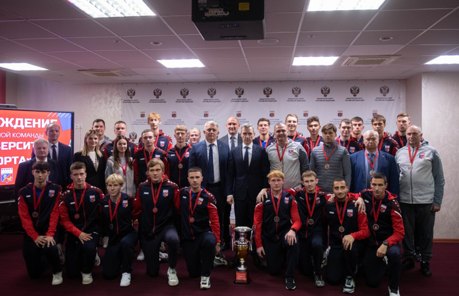 Губернатор Смоленской области Василий Анохин вместе с президентом Союза Федераций футбола "Центр" Эдуардом Малым вручили игрокам кубок и медали.