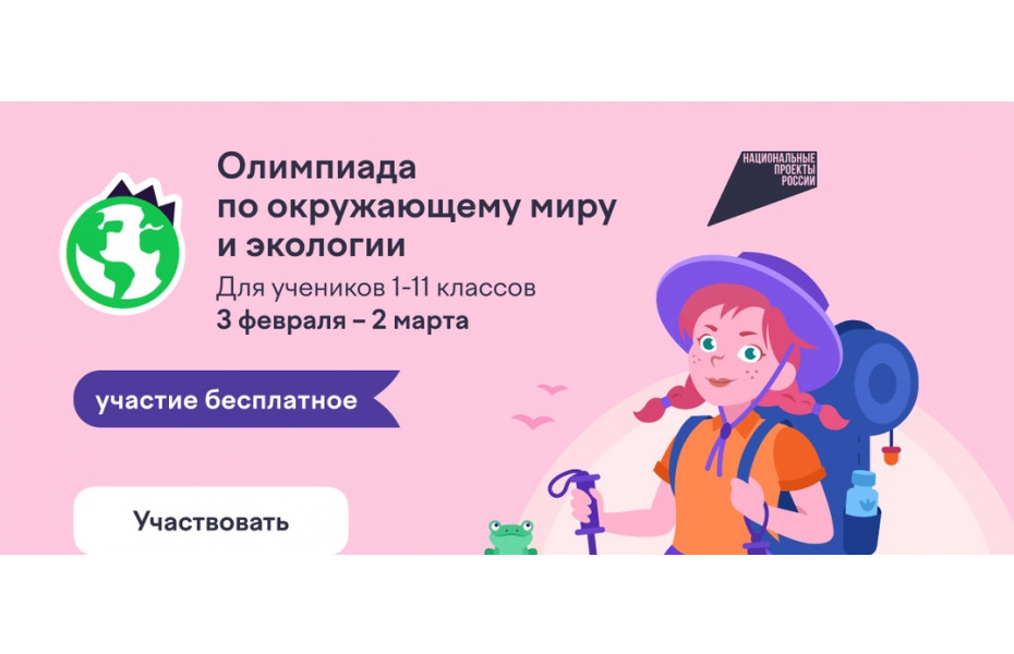 С 3 февраля по 2 марта в рамках национального проекта «Экологическое благополучие» на образовательной платформе Учи.ру проходит Всероссийская онлайн-олимпиада по окружающему миру и экологии. Ее цель – научить школьников бережному отношению к природе и основам разумного потребления.