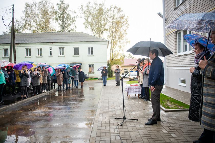 Алексей Островский: Дорогие смоляне, дорогие сычевляне! С большой радостью сегодня приехал к вам в Сычевку. Несмотря на дождливый день, событие, в честь которого мы все здесь сегодня собрались, очень радостное. Со строительством этого многоквартирного дома в области фактически стартовала программа обеспечения медицинскими кадрами центральных районных больниц муниципальных образований Смоленщины.