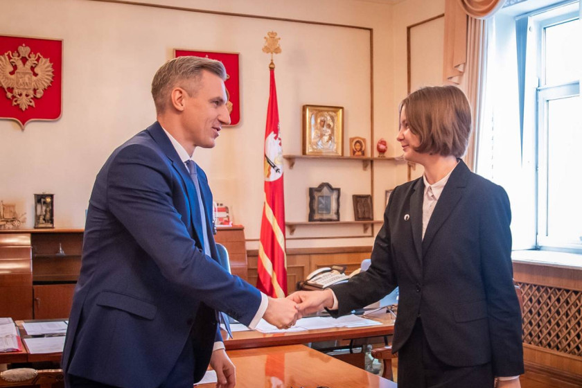 Губернатор Василий Анохин встретился с ученицей 10-го класса средней школы №8 города Смоленска с углублённым изучением иностранных языков Дарьей Серой. Смолянка стала обладателем областного гранта на реализацию проекта помощи онкобольным детям, которые проходят лечение в медицинских учреждениях Смоленской области.