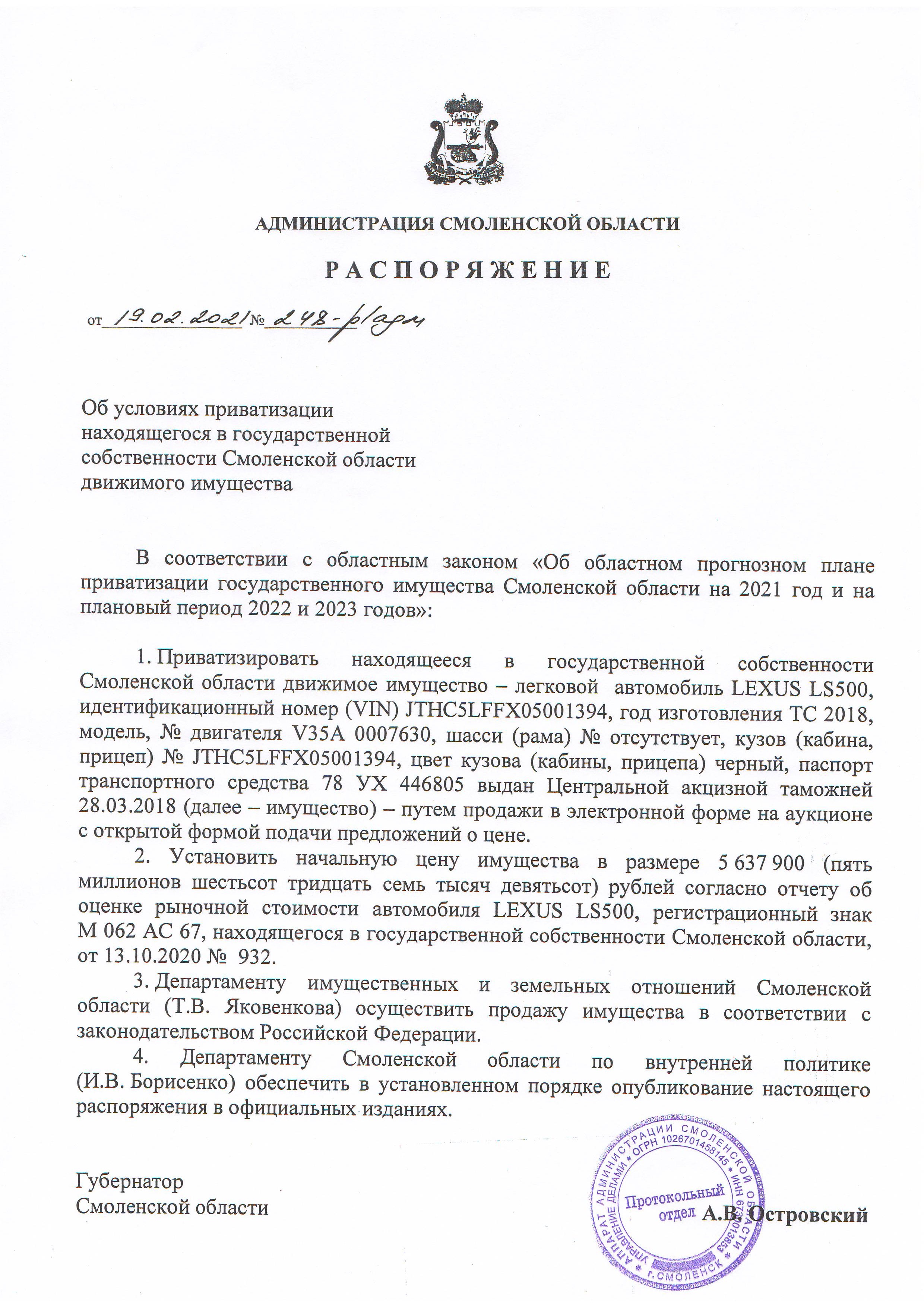 Распоряжение Администрации Смоленской области "Об условиях приватизации находящегося в государственной собственности Смоленской области движимого имущества" от 19.02.2021 №248-р/адм
