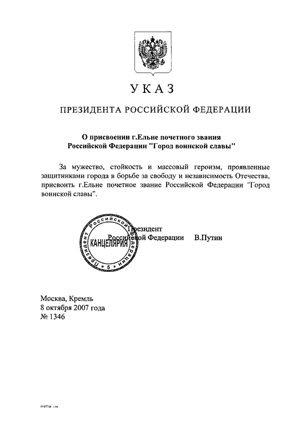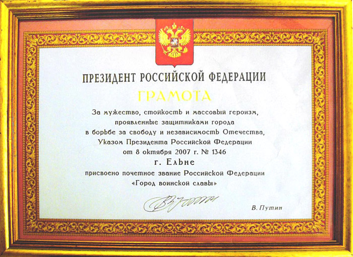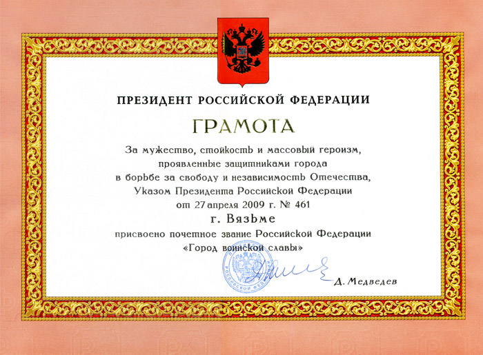 27 апреля 2009 года Указом Президента Российской Федерации городу Вязьме присвоено почетное звание Российской Федерации «Город воинской славы».